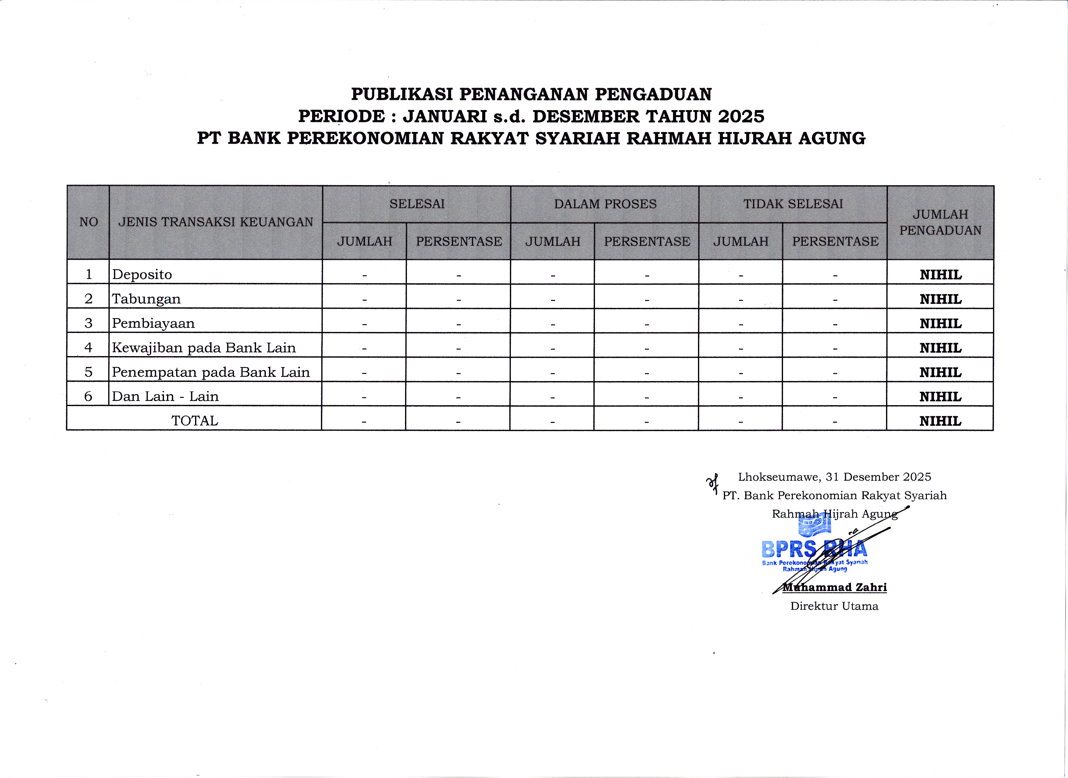 Direksi PT BPRS Rahmah Hijrah Agung telah melaksanakan